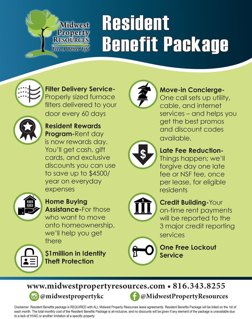 **BONUS AMENITY INCLUDED** A portion of the Tenant's total amount due will be used for the Resident Benefit Package. This includes HVAC filter delivery service, resident rewards program, identity theft protection, credit building, move-in concierge and much more. Ask your property manager for more details!